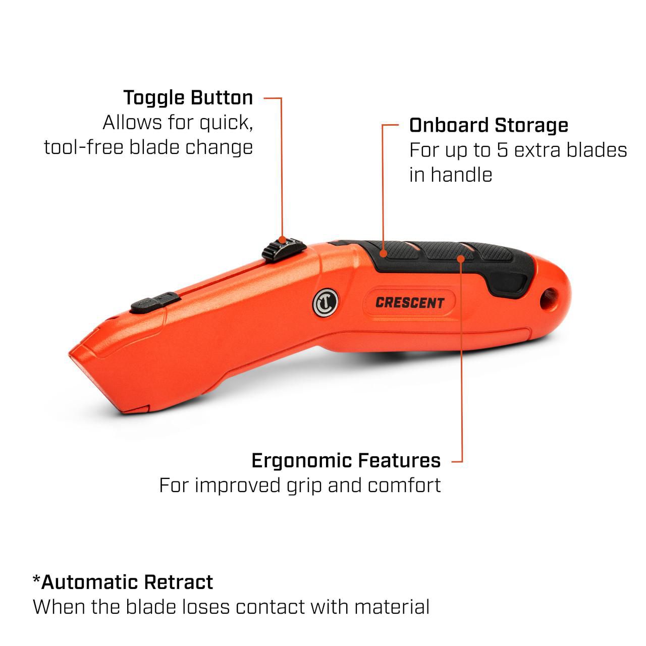 Description:- The Crescent CTKAR auto-retracting utility knife is engineered for jobsite safety. Its blade automatically retracts once it loses contact with material, helping reduce the risk of injury.