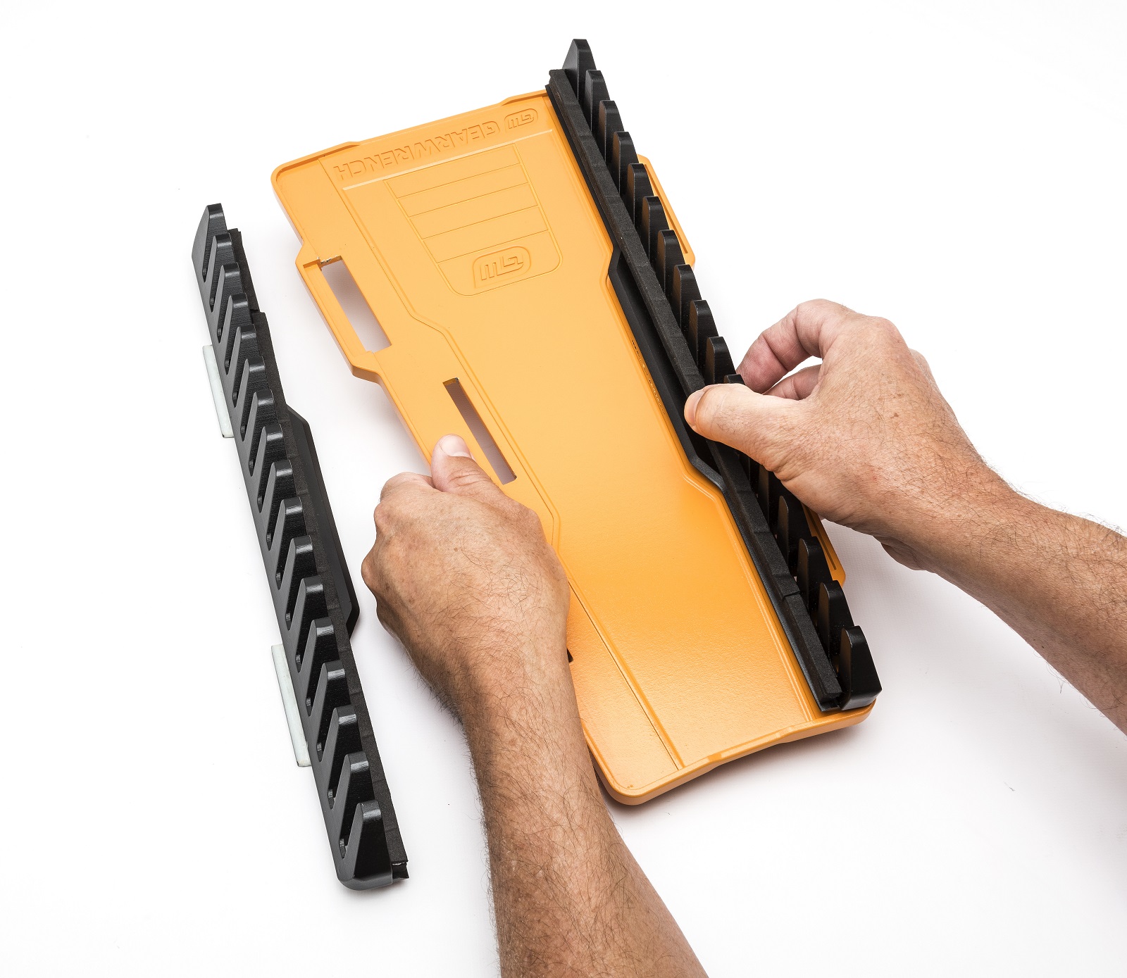Description:- The GEARWRENCH 83120 Reversible Wrench Rack Set contains 2 space-saving organizers that each hold up to 13 SAE or metric wrenches, of sizes up to 1 inch or 25mm. Designed for the professional automotive or industrial technician, these racks include key usability features like the self-aligning, quick change, & reversible side rails along with the reinforced plastic composite material slots that guides wrenches so they always face forward for quicker & easier identification. Our angled design takes up 30% less space in your tool drawer, and the two included racks have different colored side rails for easy differentiation