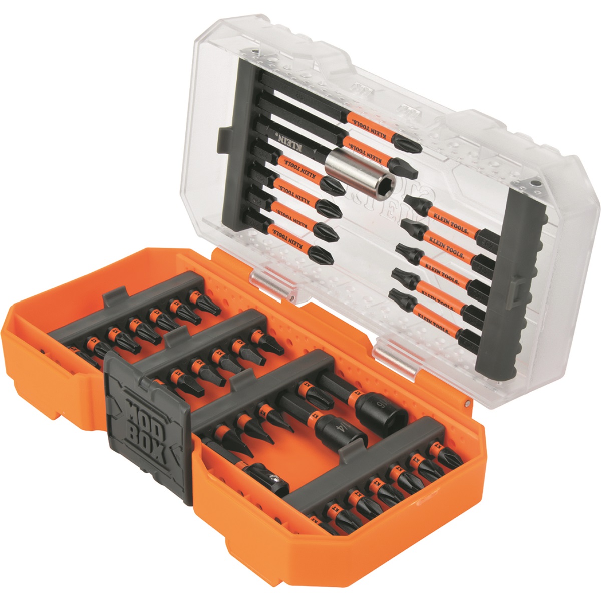 Description:- Klein Tools designed a set of ProFlex Torsion Zone Impact Driver Bits for the professional tradesman and do-it-yourself enthusiasts. All of the bits are made of high-impact rated S2 steel and feature an optimized torsion zone that absorbs impact forces to increase the lifetime of the bit. The 3-Inch bit holder and 1/4-Inch and 5/16-Inch nut drivers have strong magnets to easily hold bits and fasteners in place. Minimal chamfering on the nut drivers hex pockets increases surface contact between the nut and driver for better performance. All 40 pieces fit in a durable, impact-resistant case featuring steel hinges, a stay-shut latch and modular stackability with other cases of similar design