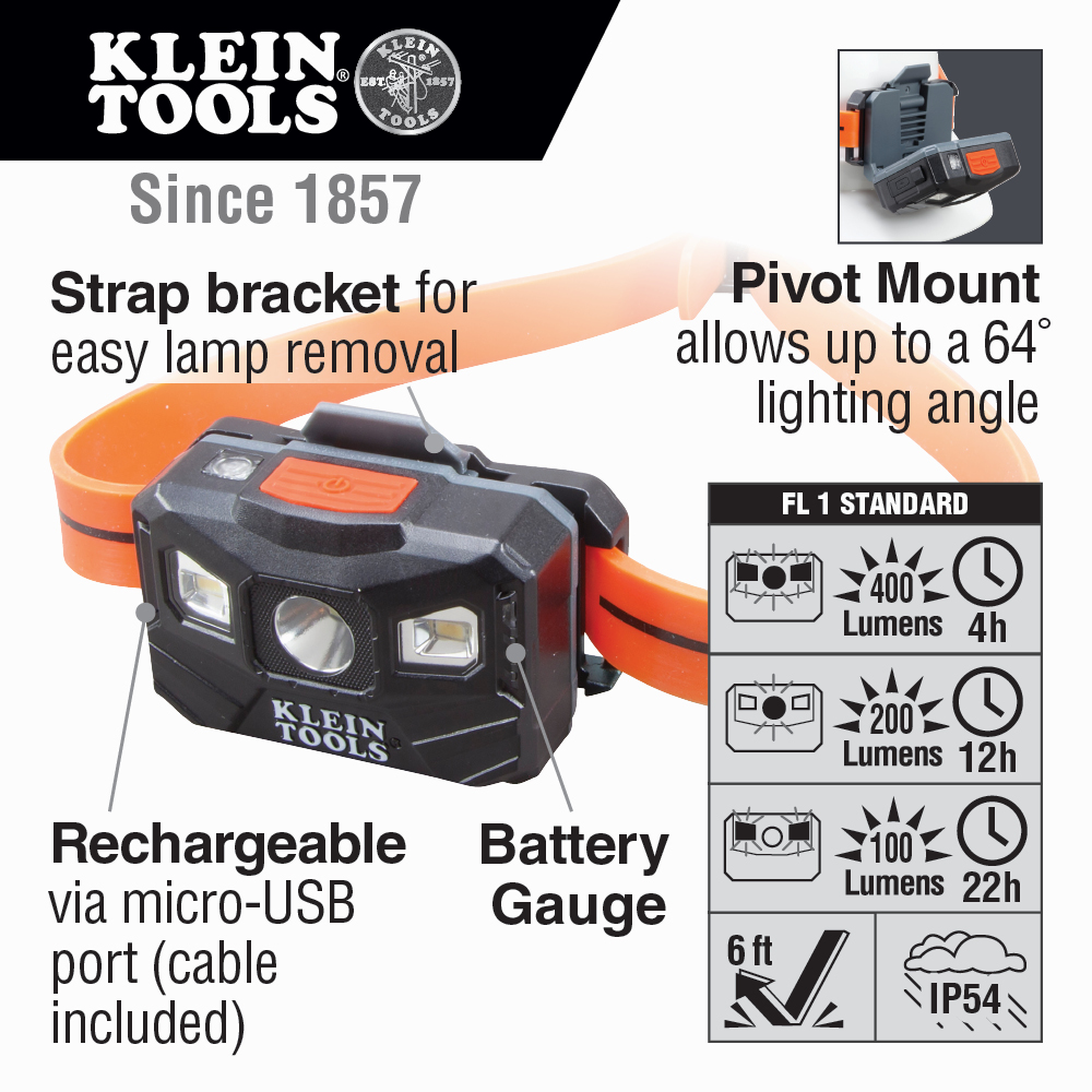 KLEIN Tools A-56064 Rechargeable Headlamp with Silicone Strap, 400 Lumens, All-Day Runtime