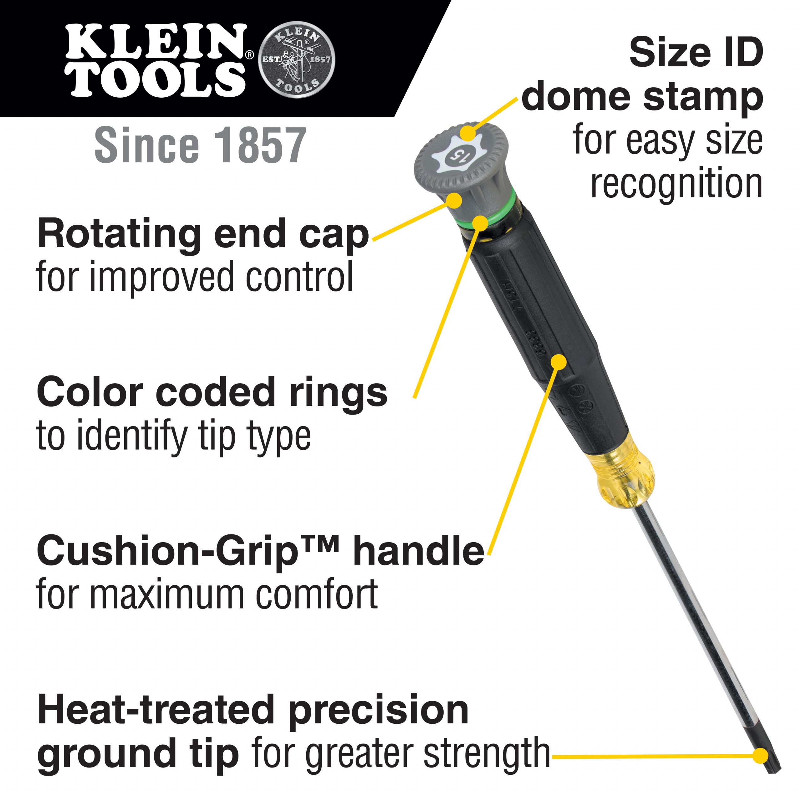 Description:- Klein Tools 8-Piece Precision Screwdriver Set helps get the job done when precision is key. These tools have all the quality and standards of full size screwdrivers with precise finger control for turning blades in tight spaces. This set includes 2 flat tip screwdrivers, 2 Phillips screwdrivers and 4 TORX® screwdrivers. Individual screwdrivers also sold separately