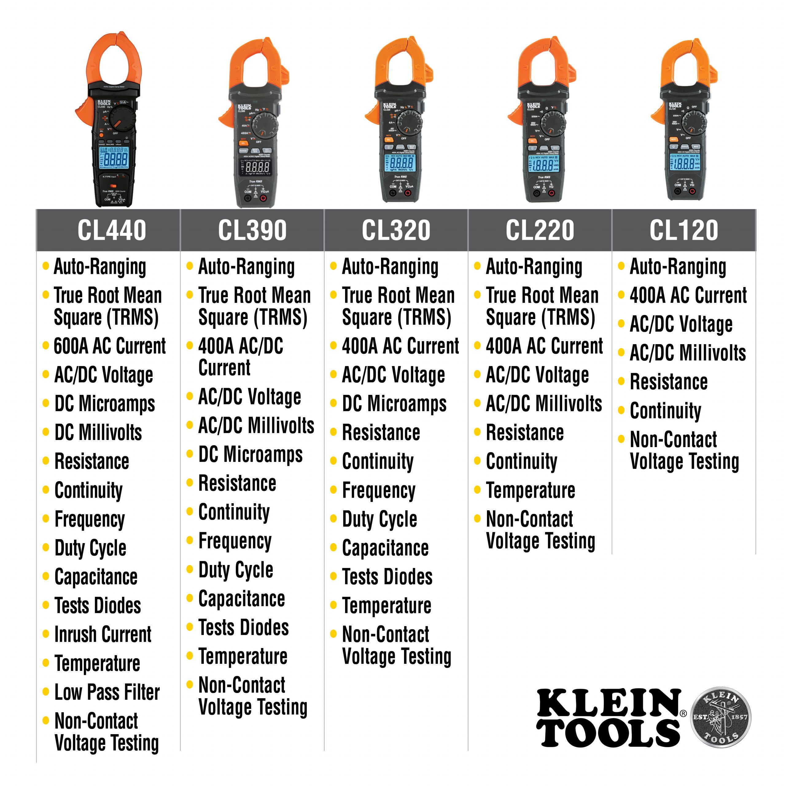 Description:- Klein Tools CL445 Clamp Meter is an advanced HVAC clamp meter with automatically ranging true root mean square (TRMS) for maximum accuracy. The meter measures AC current, inrush current, AC/DC voltage, DC microamps, resistance, continuity, frequency, capacitance, temperature, diodes, and more. This Digital Clamp Meter can simultaneously measure current and voltage, has a built-in worklight and comes with right-angle input test leads, push-on alligator clips, K-Type thermocouple, storage pouch, instructional manual, and 3 x AAA batteries