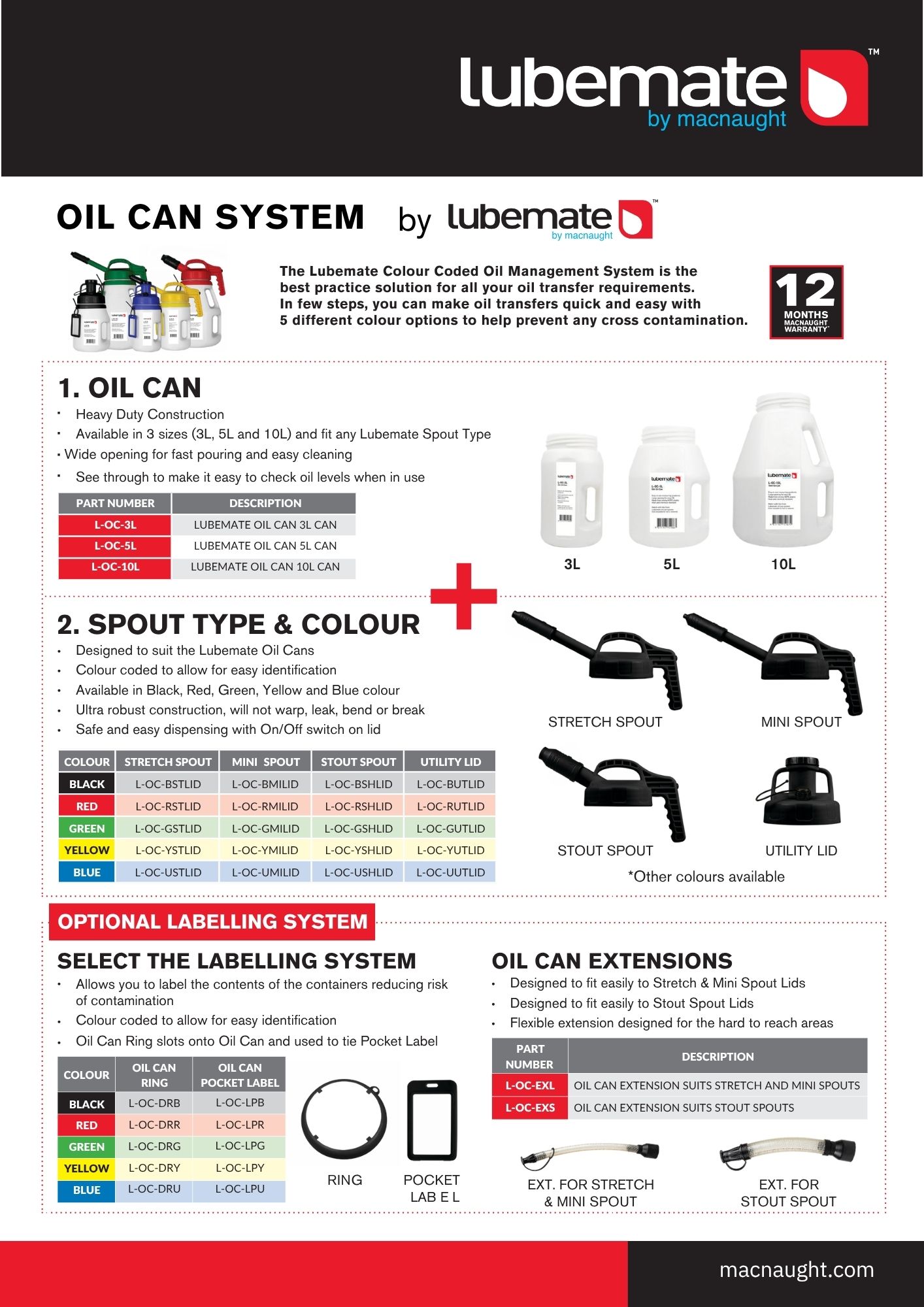 - The blue lid allows for quick fluid identification and integrates seamlessly with the complete Lubemate oil can range.