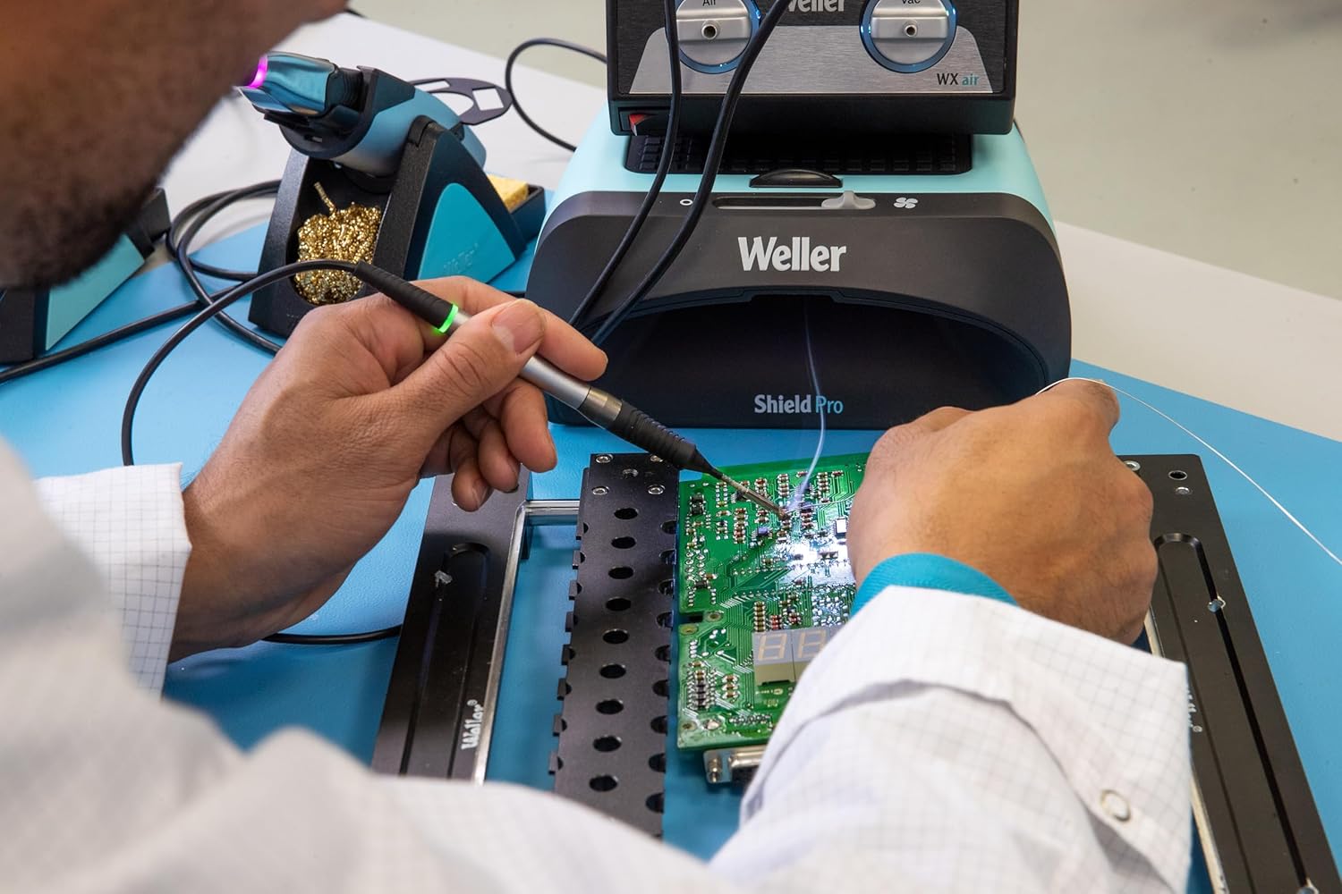 Description:- The Weller ZeroSmog Shield Pro is a compact and efficient fume extraction system designed to maintain a clean and safe work environment during soldering tasks. Its powerful blower with adjustable extraction power ensures effective removal of harmful fumes and particles, promoting better air quality at your workstation. The unit is stackable with soldering stations of all brands, optimizing workspace efficiency. Additionally, it features an illuminated work area and an ESD-safe (antistatic) housing, making it suitable for sensitive electronic work